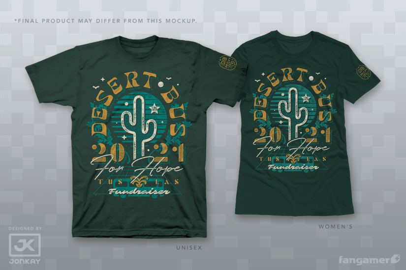 They have t-shirts during the drive and presales before the drive that $15 goes to Childs play on Behalf of Desert bus For Hope. Friends and family of mine own many years of the custom years t-shirt. If you find yourself loving the fundraiser and enjoying the team it might be great to own your own shirt. You can get them at Fangamer They are $28 USD they ship to many places in the world.
