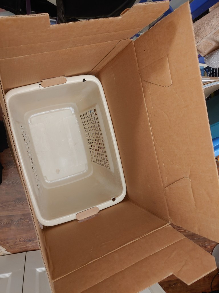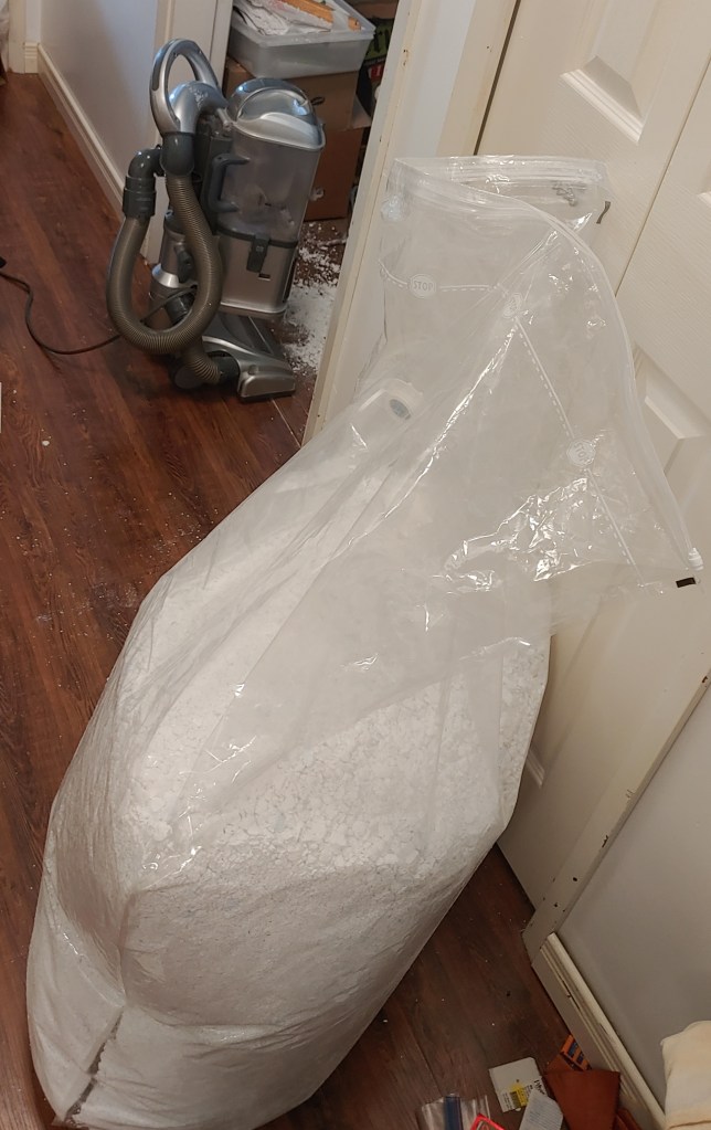 So I put the vacuum bag in a laundry basket. Unzipped the 2 zippers and got a container (a 2L soda bottle with the top cut of) to scoop it out. I thought after a bit of that, this isn’t going fast enough for my liking. Instead of waiting for help I decided how hard could this be? (please note any of my family might tell you to get out while you can, when I have a plan of “ll do it myself”)