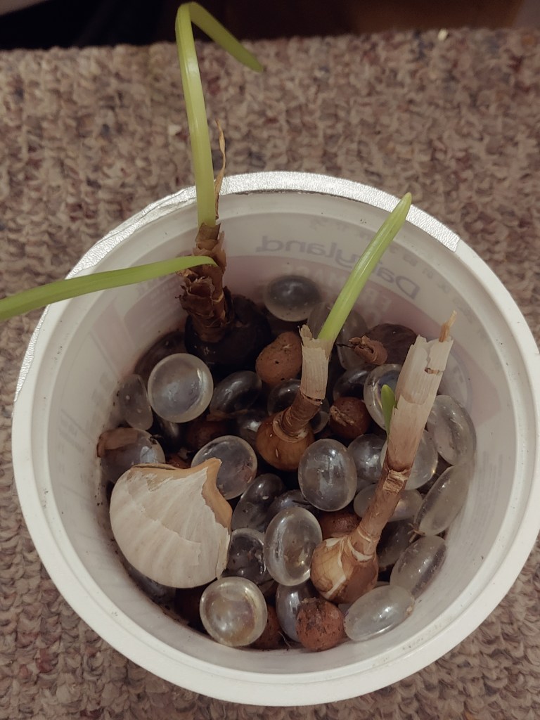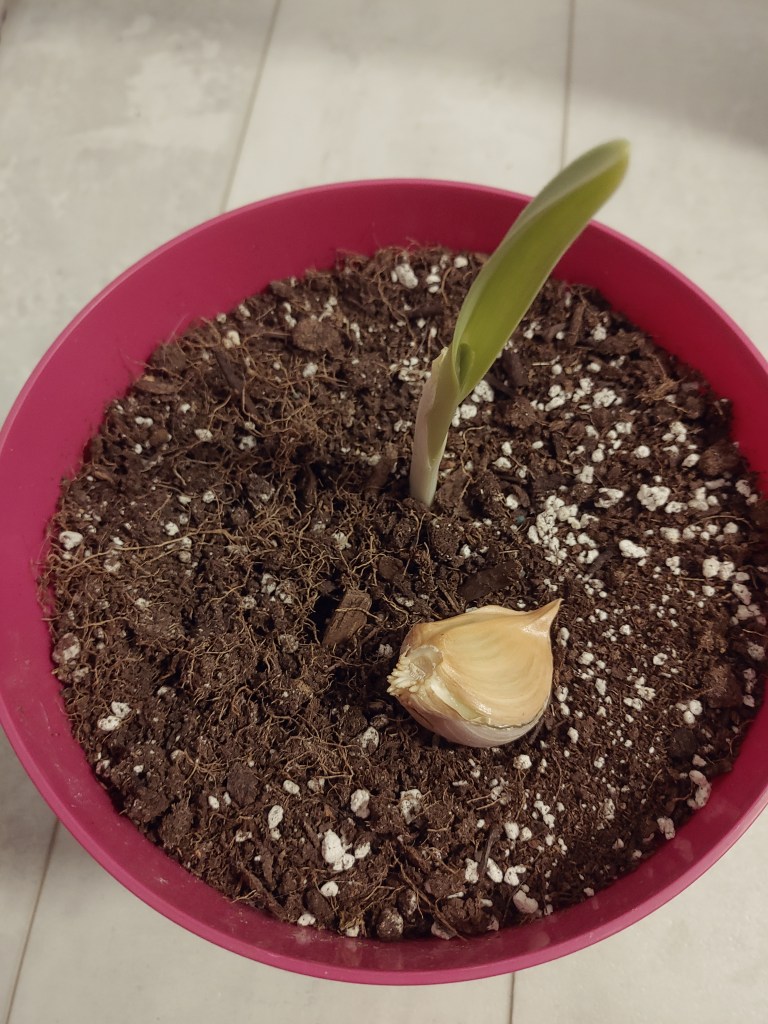 Photo taken by myself. My growing garlic stem and a clove I’m rooting this week.