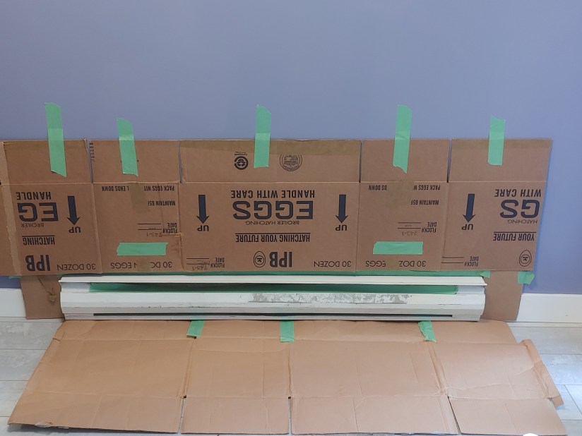 So I had to use heat resistant spray paint in the house. I was panicked about spraying the nice newly painted walls behind the heaters so I had to get creative. I tore open two boxes, taped the open spots on the cardboard then we taped the wall right above the heater with two inch painters tape. Under the heater is where I tucked the second box. We started with a piece of tape inside the heater to keep the slats free of paint, which did not work so well. I had to try to learn it would not work. I ended up taking a lip of the box and putting it in the heater and then spraying the inner edge. (When I took the cardboard off I noted the wall got sprayed a bit when I did the upper spray. Next time I will tape the carboard to the green tape. Good thing I know how to do quick touch ups!)