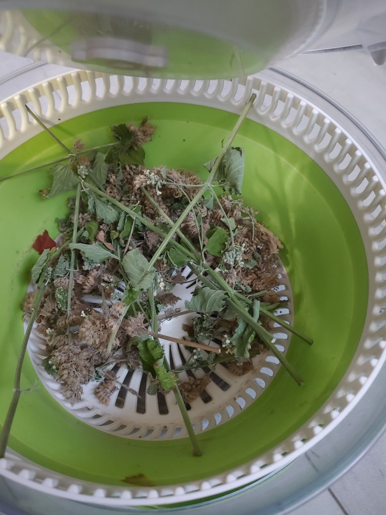 I have tiny catnip seeds that are hugged into their dried flower stalks very tightly. Up till now I close my hand loosely around the flower head and spin the stick working out the seed with the spinning motion hitting my hand.. It is a slow process. I was like I have a salad spinner that would do that on a larger scale on one stalk at a time.  I stuffed all the stalks in, put the lid on and pulled the tab that spins this thing like mad.