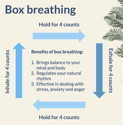 - Square breathing (box breathing) inhale for the count of 4, hold the breath for the count of 4, exhale for the count of 4 and rest for 4 more.