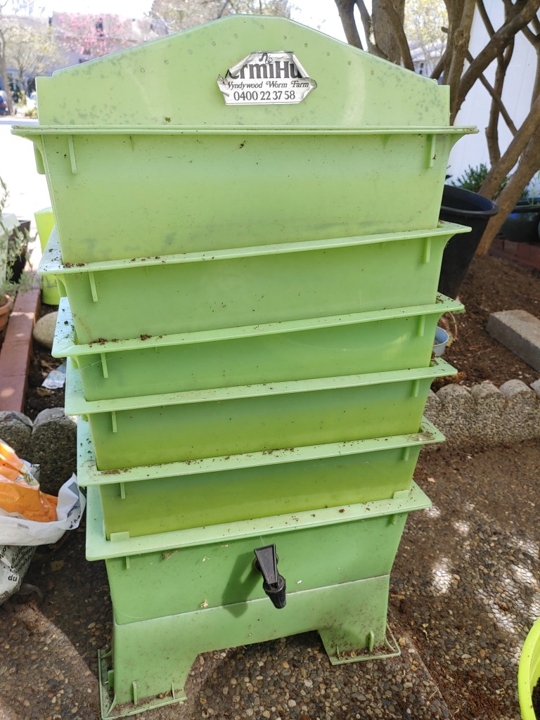 I really love my stacking worm system. I can take off one layer at a time. As I had shared before with some of the things going on with my health, I don’t always have enough energy for a big project. Two or three times a year I sort out my worms and start new trays. When I had to do this with my huge bin it was too much work.