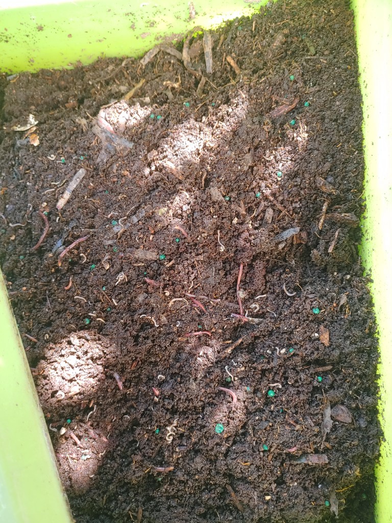 I dumped in old potting soil at the end of late summer, the soil had green slow release fertilizer in it so that is one thing the worms will not break down. Meet some of my worms! Wave your tails little guys! This bin has a bit more work for the worms.